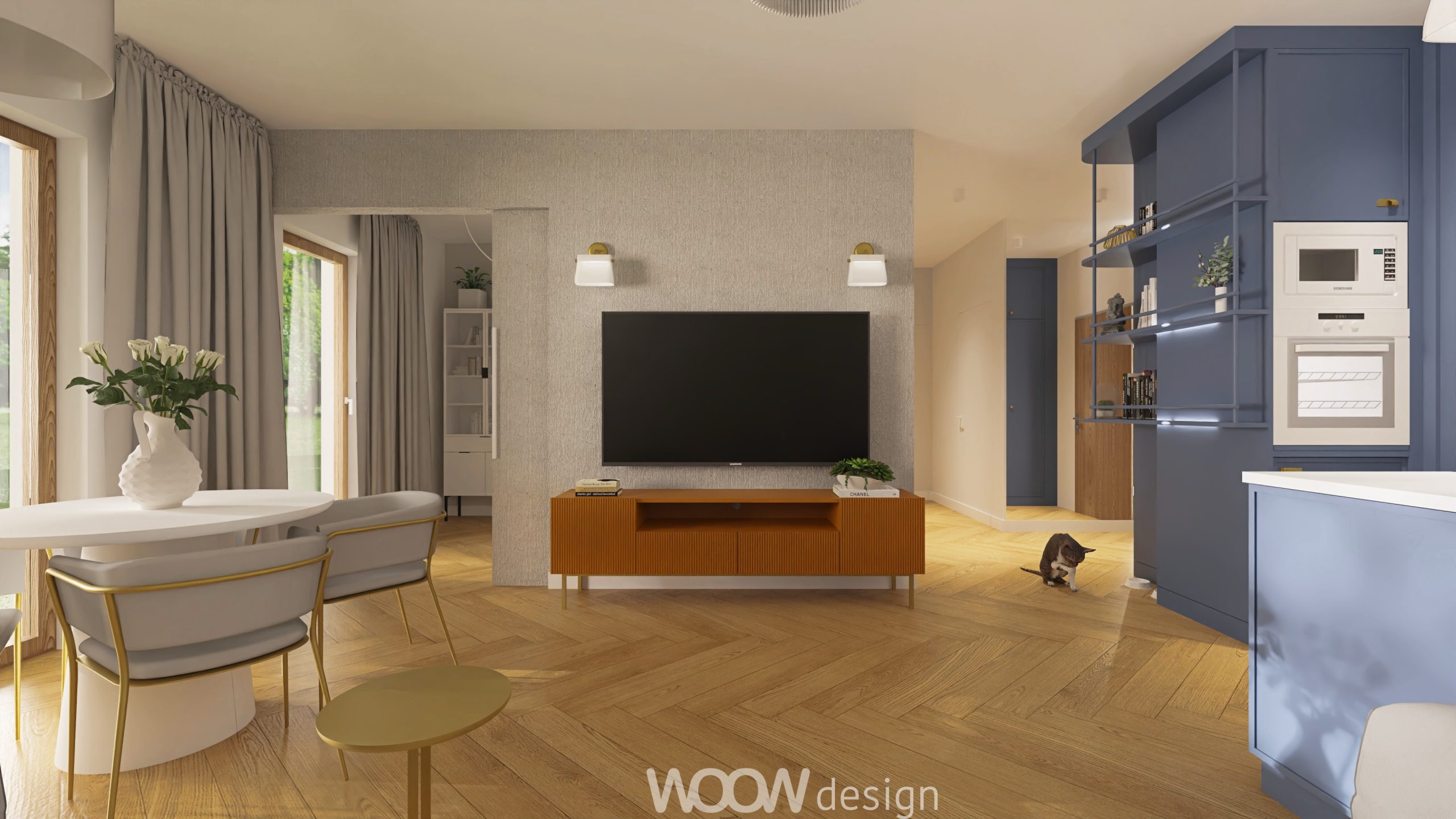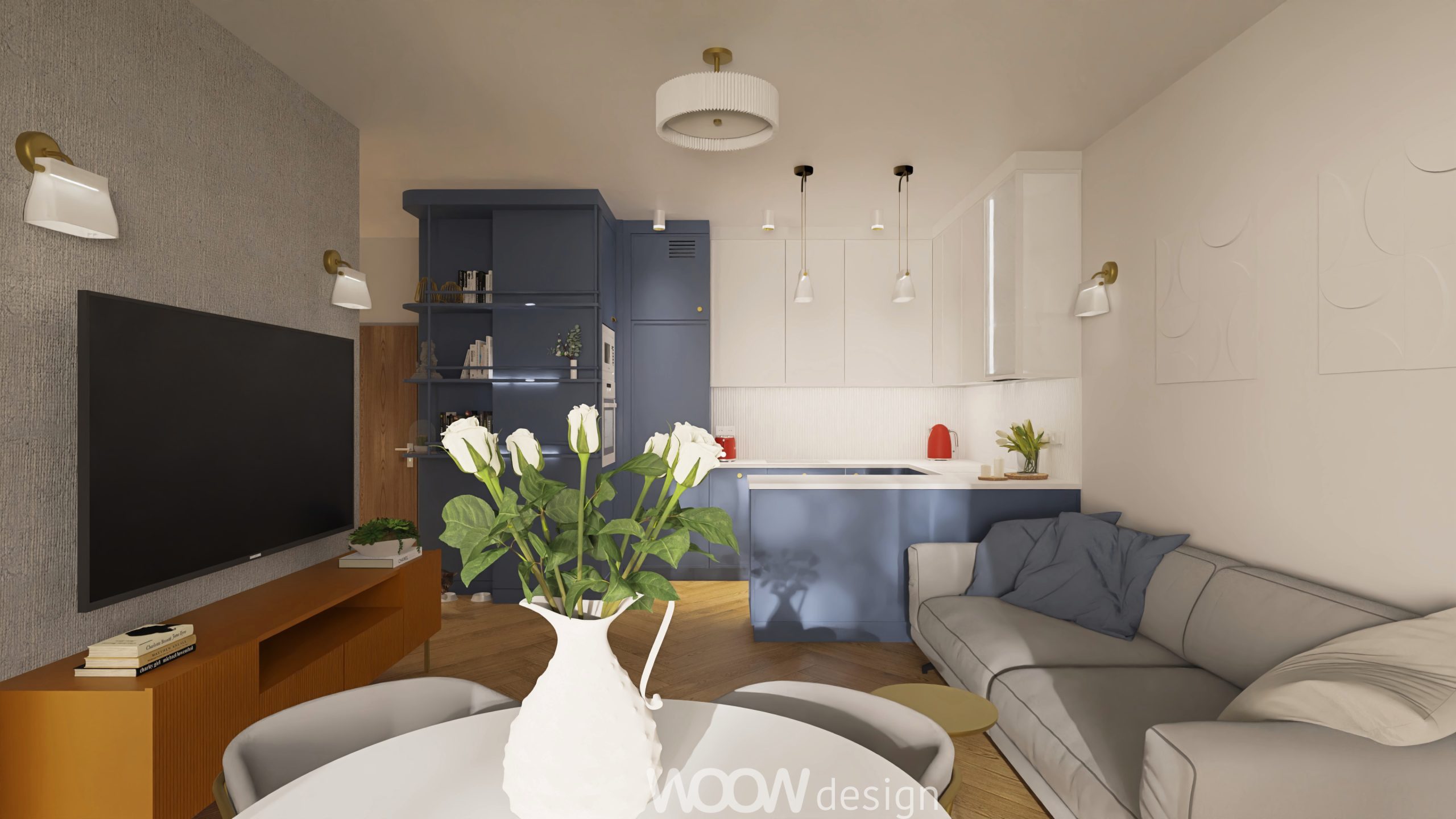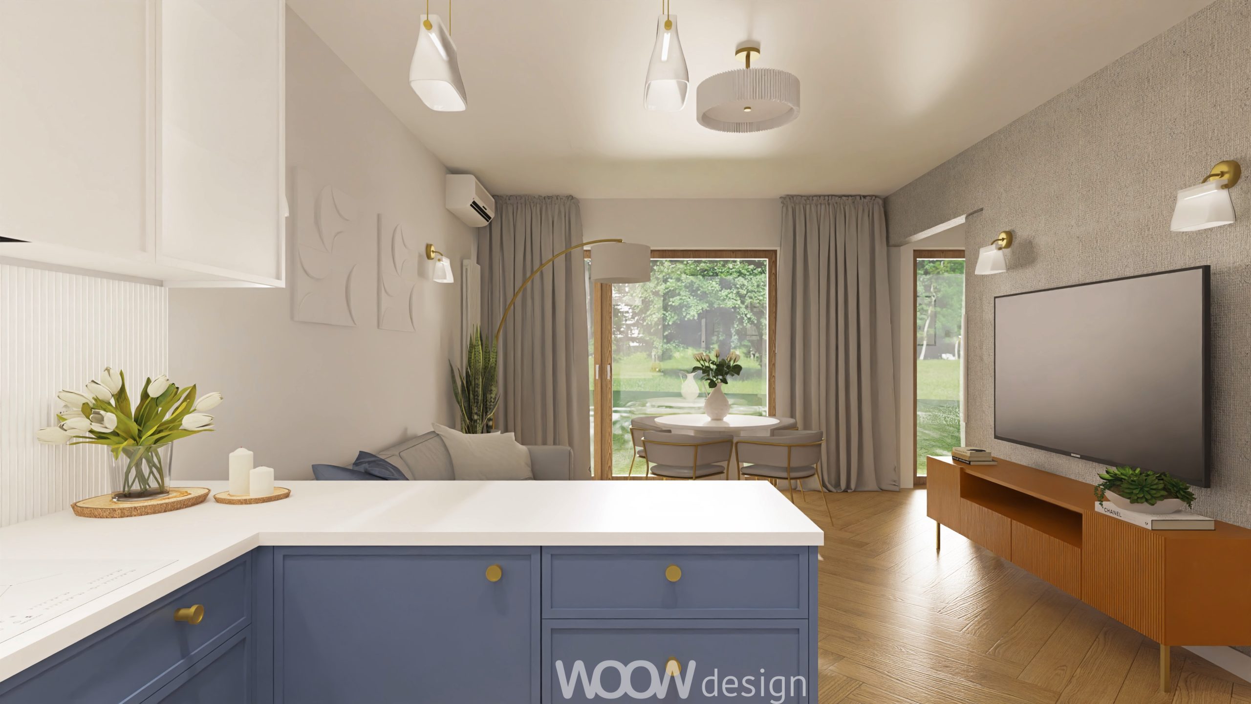 Bazą kolorystyczną projektu są biel i odcienie niebieskiego – zestawienie, które wprowadza do wnętrza spokój, elegancję i poczucie przestrzeni. W strefie dziennej znajduje się otwarta kuchnia z salonem, płynnie przechodząca w zielony ogródek. Kuchnia z niebieskimi frontami, złotymi uchwytami i białym blatem została wzbogacona o dekoracyjne dodatki – świeże kwiaty, świece i szkło – które nadają jej domowego charakteru.