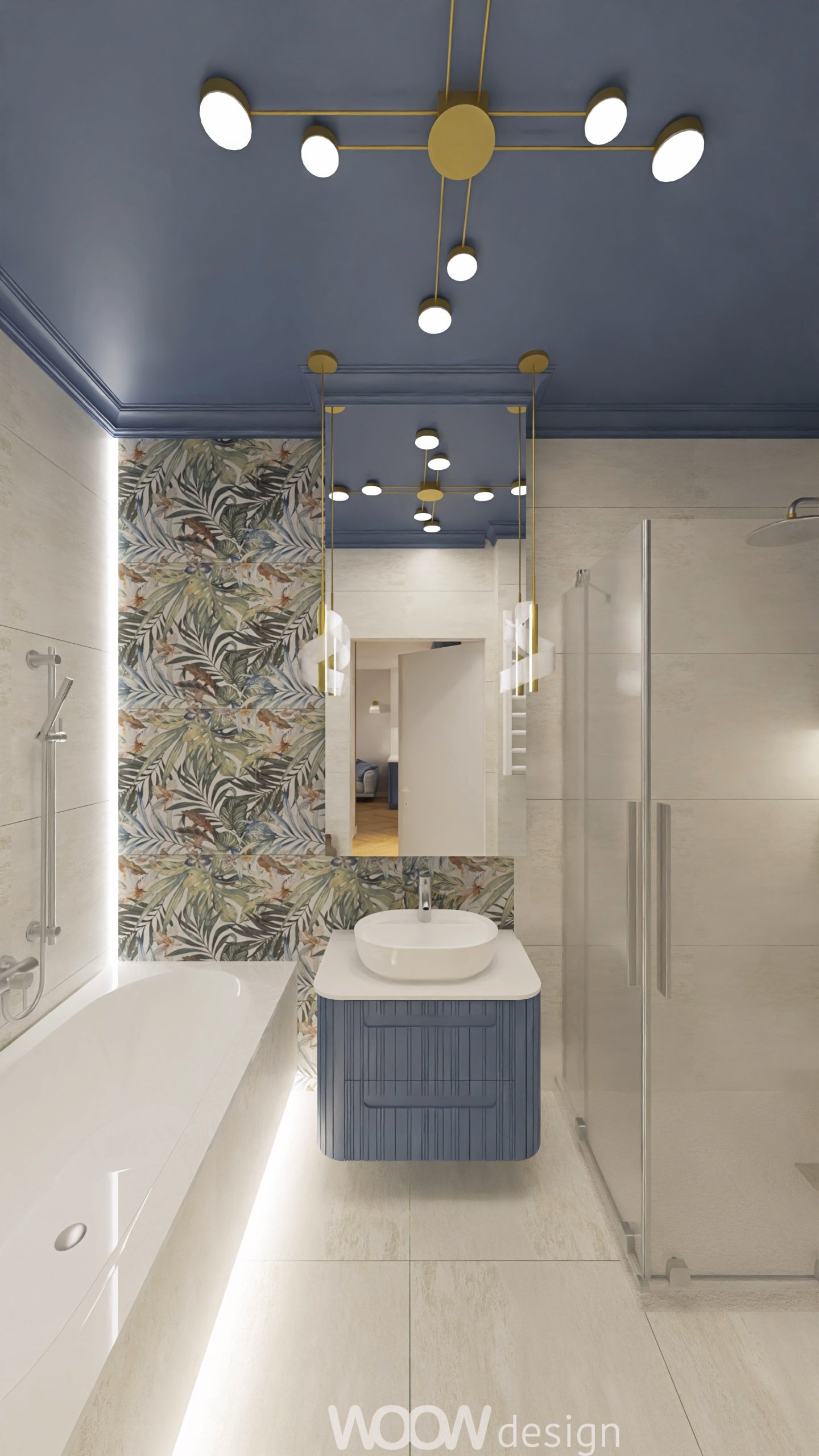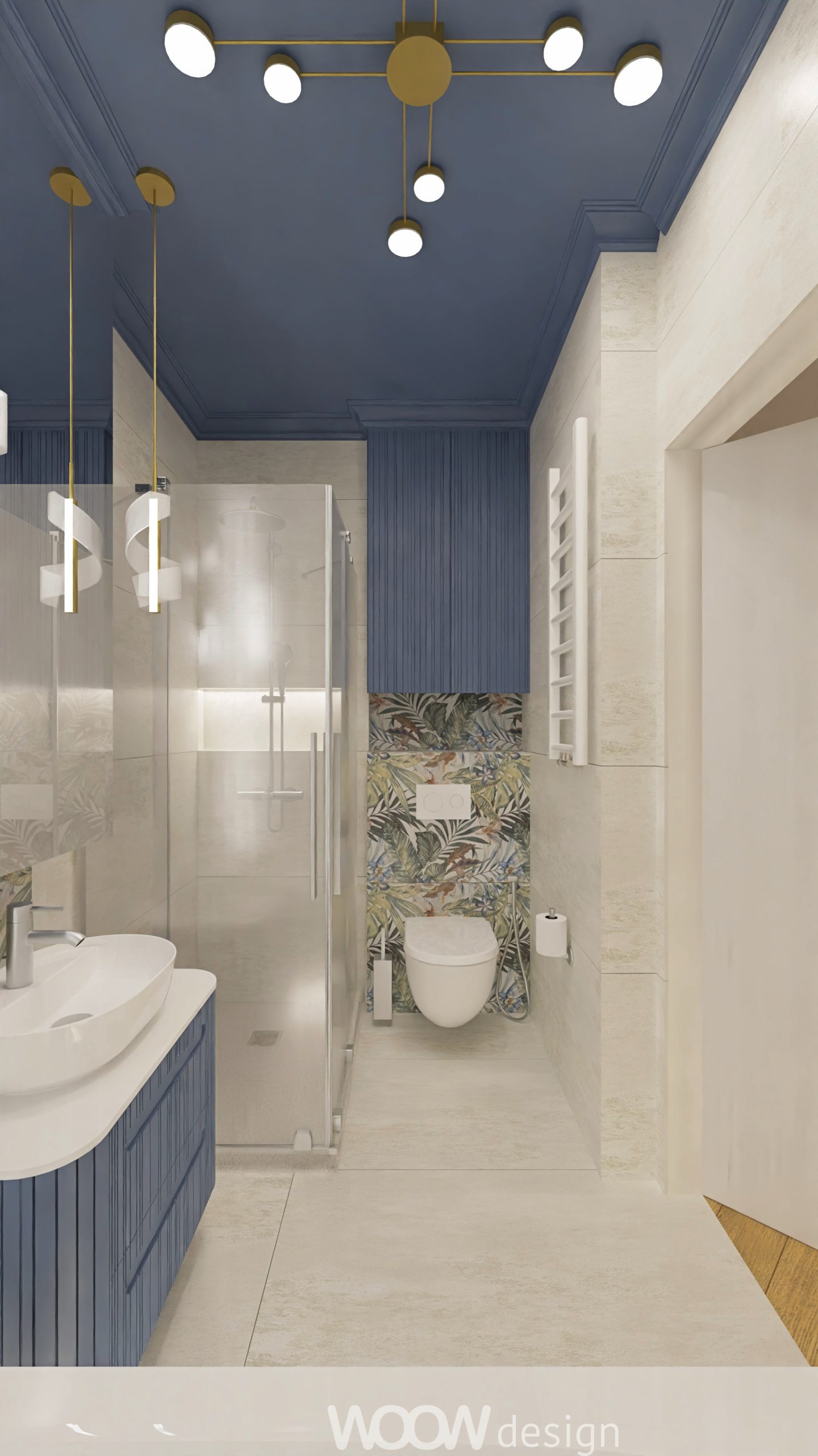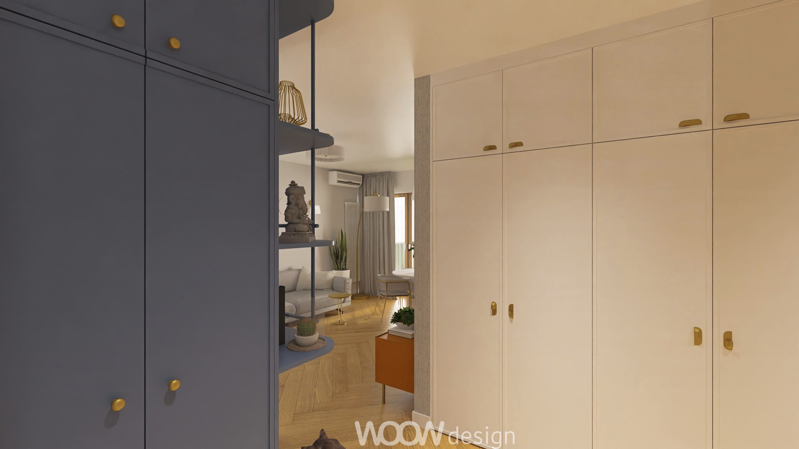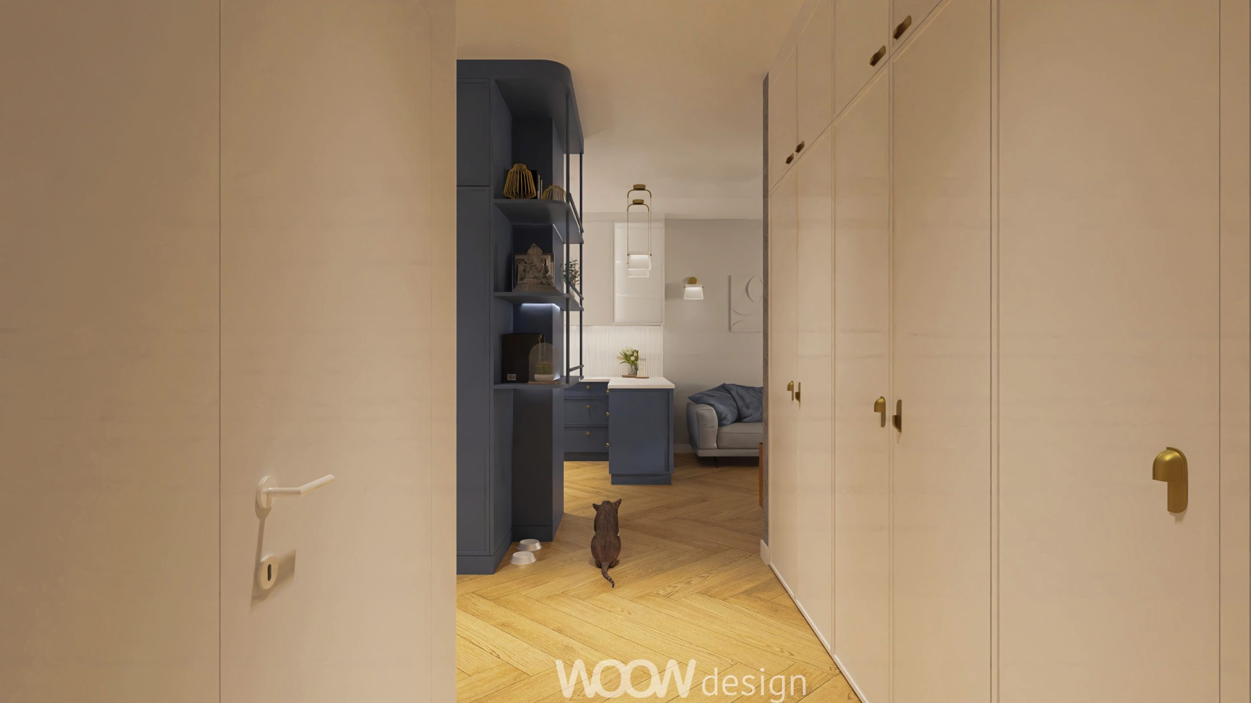 Bazą kolorystyczną projektu są biel i odcienie niebieskiego – zestawienie, które wprowadza do wnętrza spokój, elegancję i poczucie przestrzeni. W strefie dziennej znajduje się otwarta kuchnia z salonem, płynnie przechodząca w zielony ogródek. Kuchnia z niebieskimi frontami, złotymi uchwytami i białym blatem została wzbogacona o dekoracyjne dodatki – świeże kwiaty, świece i szkło – które nadają jej domowego charakteru.
