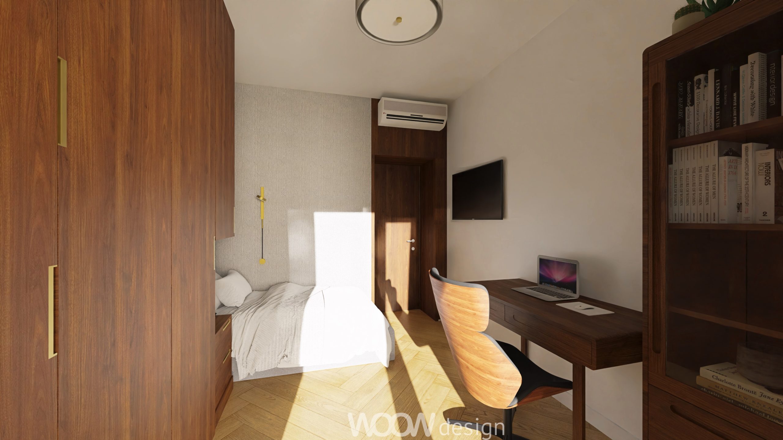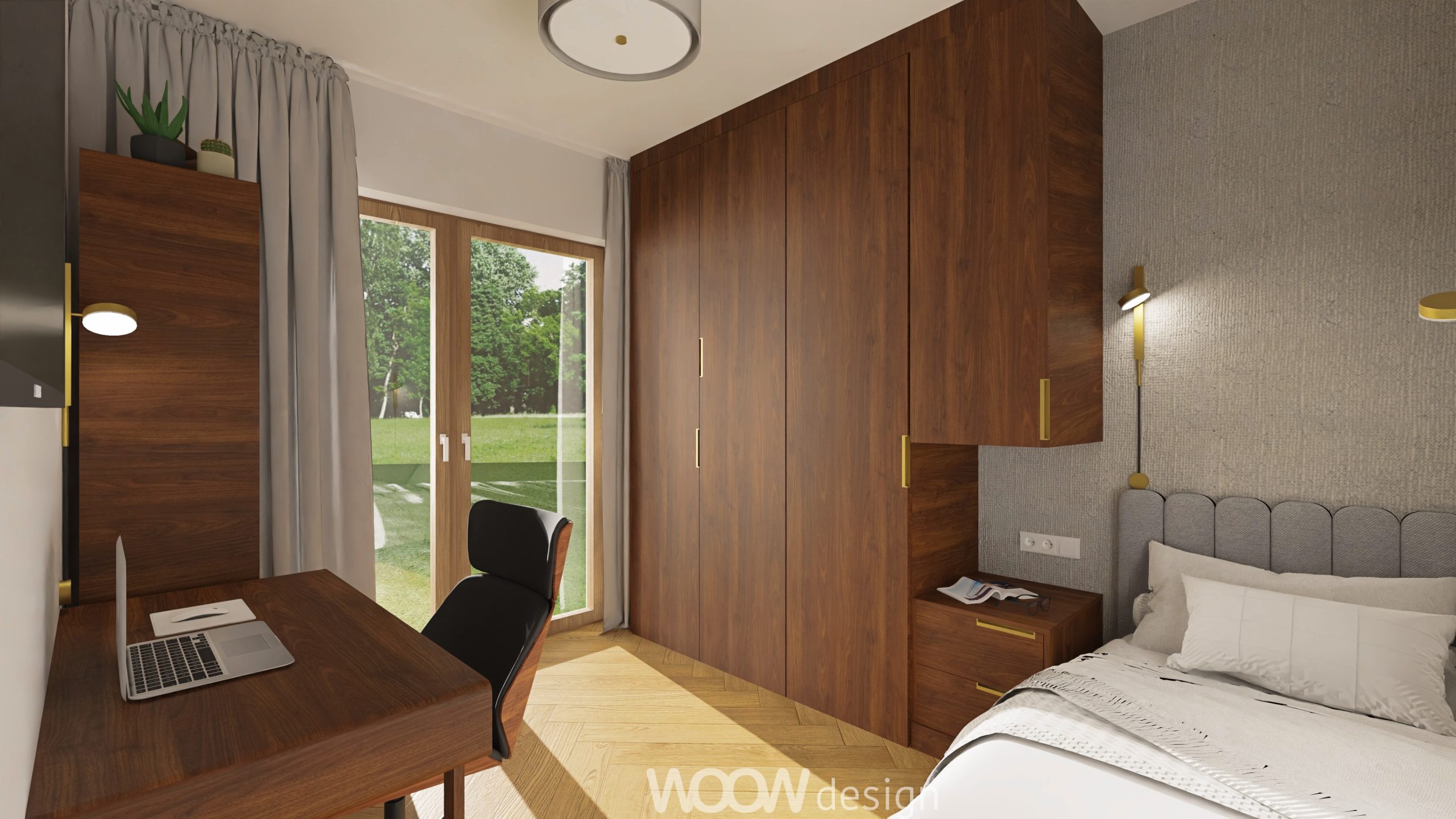 Projekt uwzględnia również potrzebę prywatności – wydzielone pokoje dla żony i męża to osobiste przestrzenie, zaprojektowane z myślą o ich indywidualnych stylach i funkcjach. Każdy z nich stanowi odrębną strefę komfortu, sprzyjającą pracy, odpoczynkowi i wyrażaniu siebie.