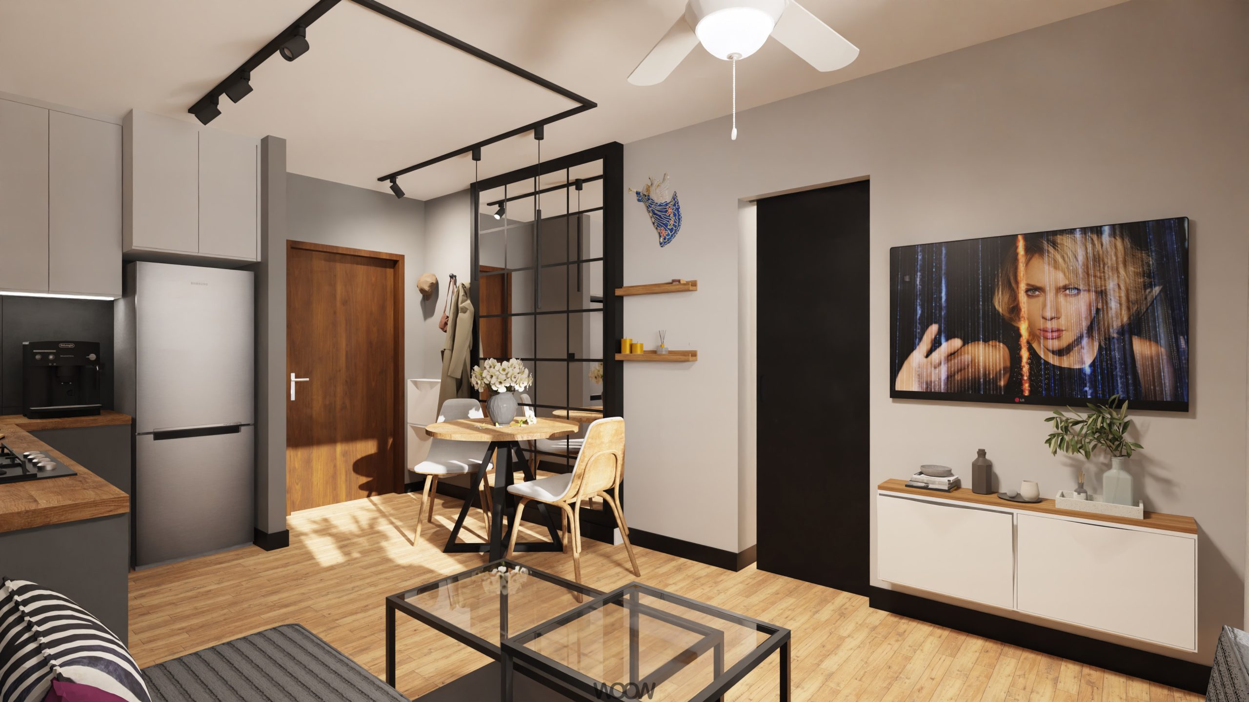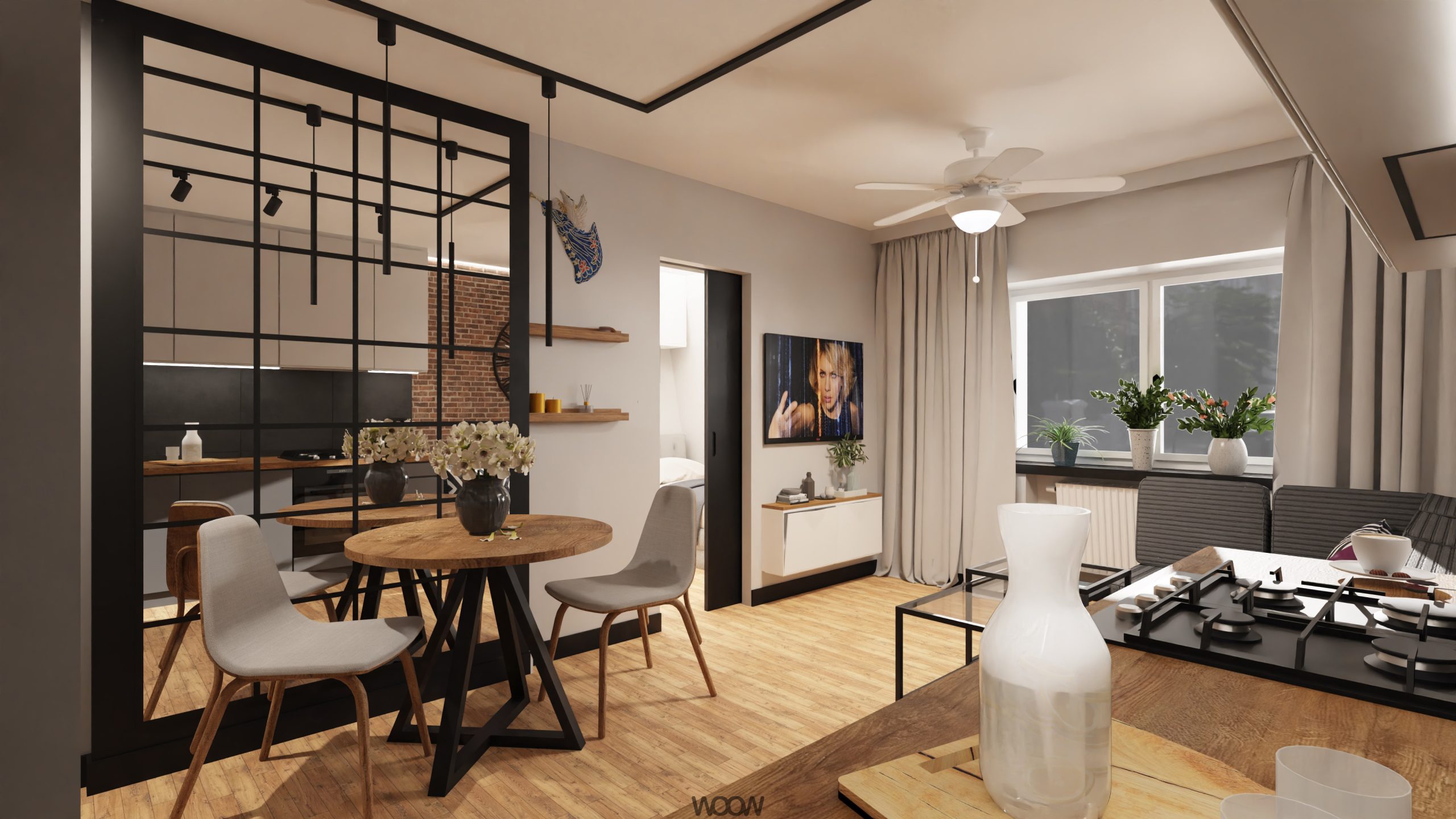 • Przeszklona ścianka z czarną ramą, subtelnie dzieląca przestrzeń bez utraty światła