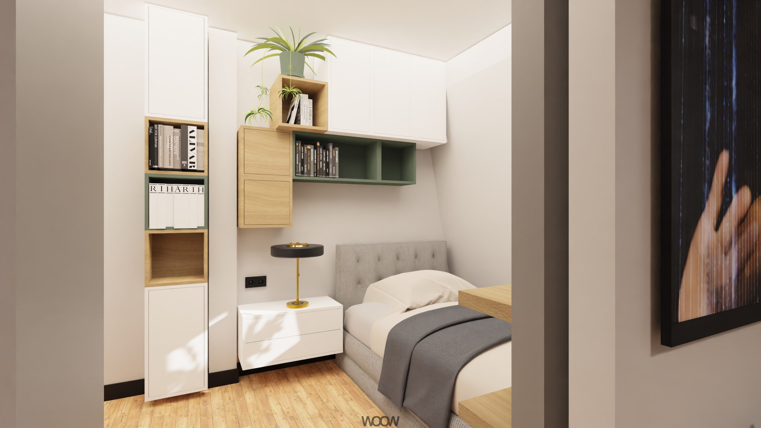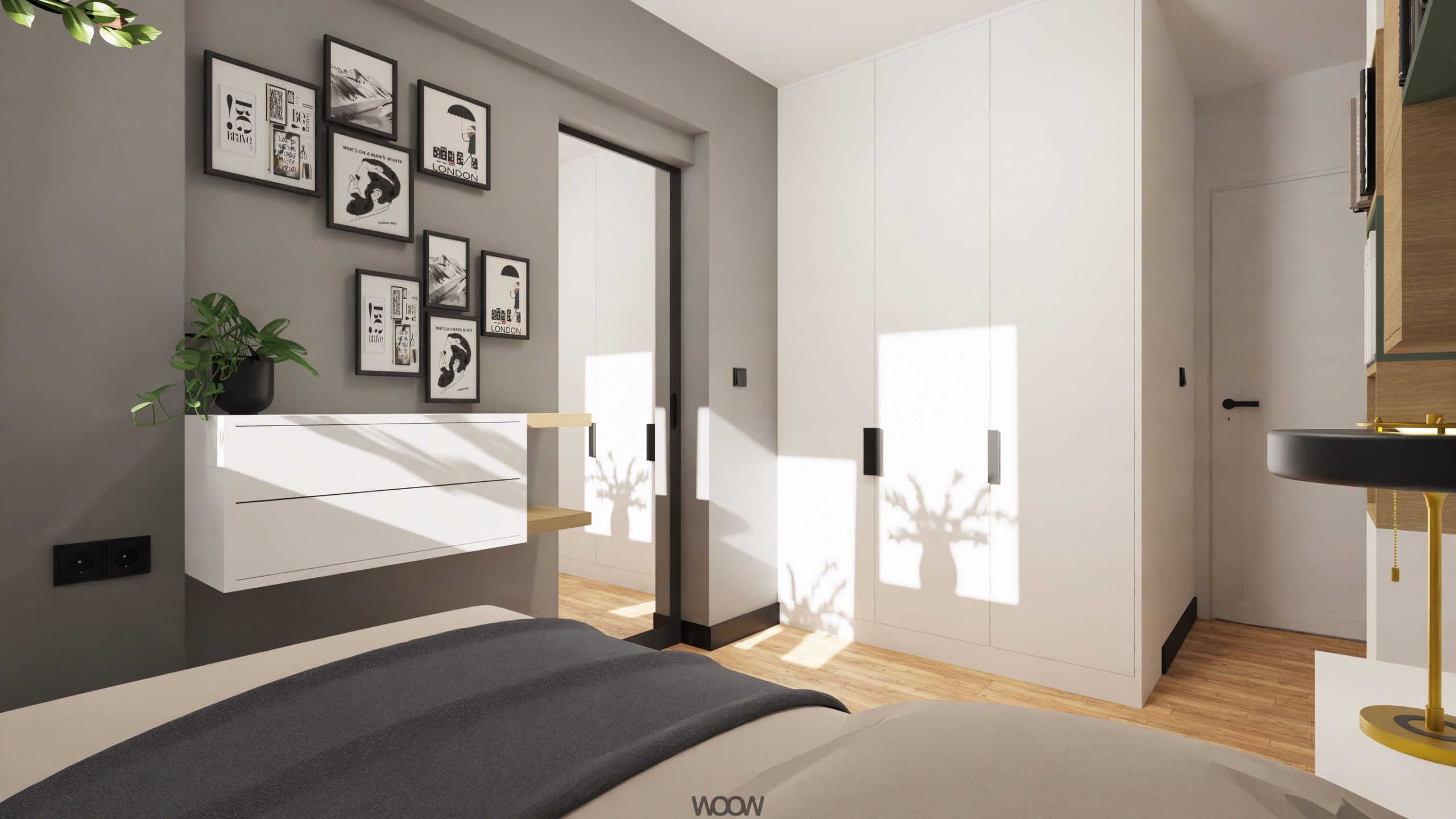 Sypialnia to przykład spokojnej, uporządkowanej przestrzeni, w której każdy element pełni funkcję estetyczną i praktyczną. Projekt opiera się na zasadach minimalizmunaturalnego światła i harmonii materiałów, tworząc idealne warunki do wypoczynku.