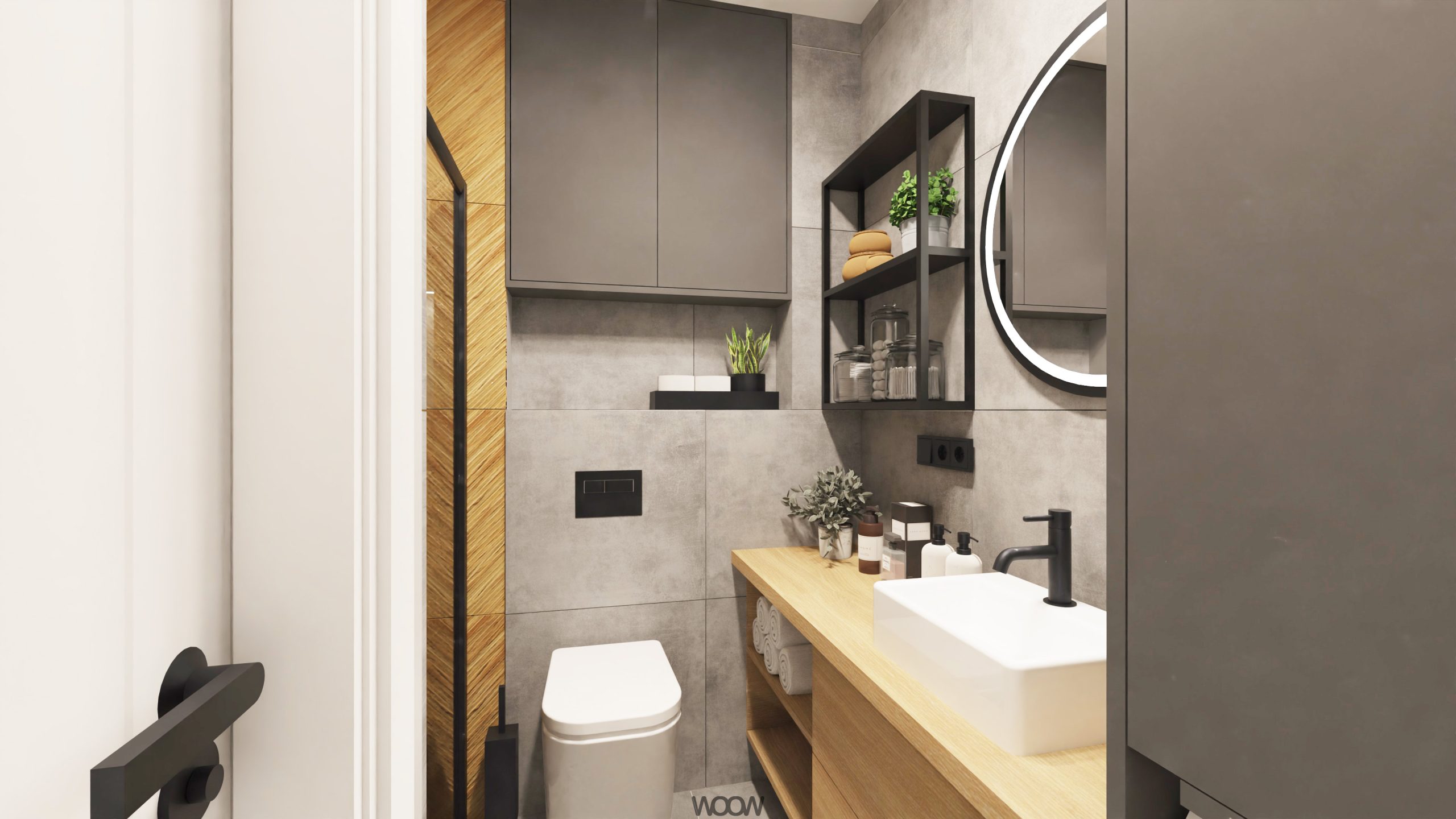 Projekt łazienki opiera się na kontrastach – ciepłego drewnachłodnych szarości i czystej bieli, uzupełnionych o subtelne detale.