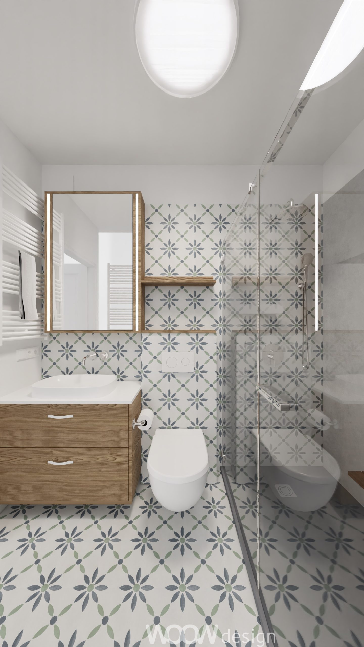 Nowoczesne łazienki z drewnem i geometrycznymi płytkami.