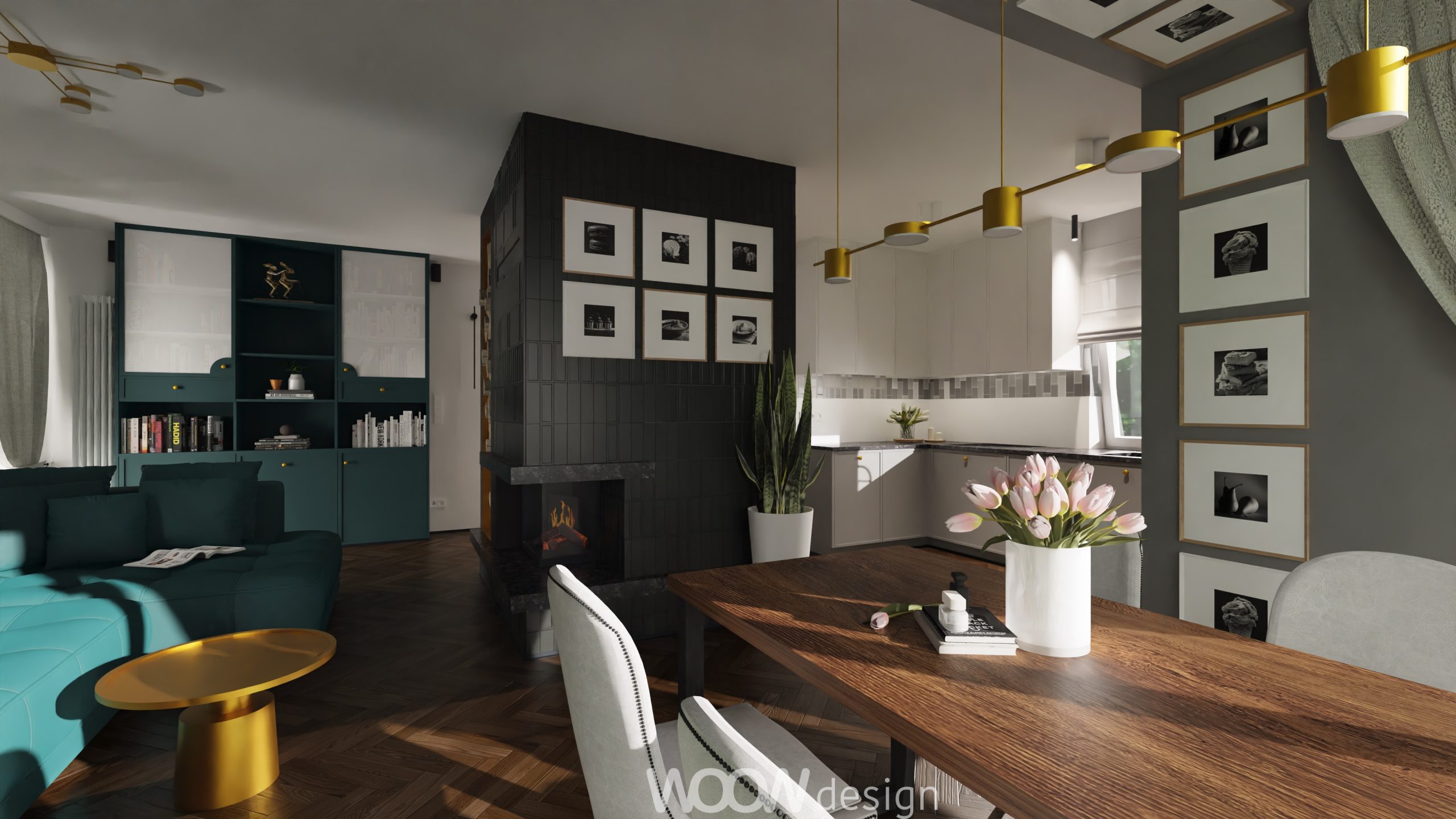 Ten projekt to odpowiedź na potrzeby kobiet, które szukają wnętrza z charakterem – niepowtarzalnego, pełnego światła, faktur i detalu. Już od pierwszego spojrzenia salon z tealową sofą, złotymi akcentami i ciemną ścianą z grafikami zaprasza do świata, w którym design spotyka emocje. Kuchnia z geometrycznym backsplash’em, białymi frontami i złotymi lampami tworzy przestrzeń codziennych rytuałów – estetyczną, ale funkcjonalną.